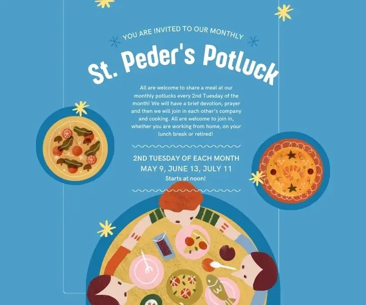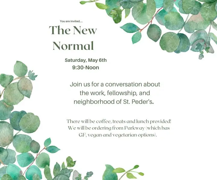 Save the Date! The New Normal You are cordially invited to The New Normal, a conversation about the work, fellowship, and neighborhood of St. Peder's. This event will be on May 6th, from 9:30 until 12 and there will be coffee, treats, and lunch provided. Further information will be coming.