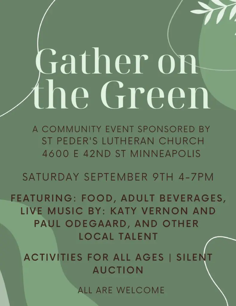 Gather on the Green SATURDAY SEPTEMBER 9TH 4-7PM A COMMUNITY EVENT SPONSORED BY ST PEDER’S LUTHERAN CHURCH 4600 E 42ND ST MINNEAPOLIS ALL ARE WELCOME FEATURING: FOOD, ADULT BEVERAGES LIVE […]